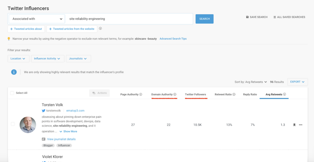 To do this, Andy Gremmett – Director of Product Marketing – pays close attention to BuzzSumo’s in-platform influencer metrics, like follower counts, average retweets, and domain authority.