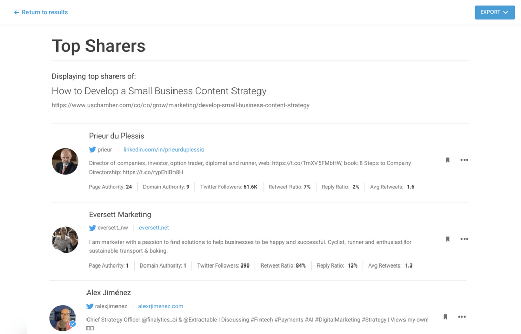 Hitting this icon will pull up a list of top influencers that shared a piece of content on Twitter.