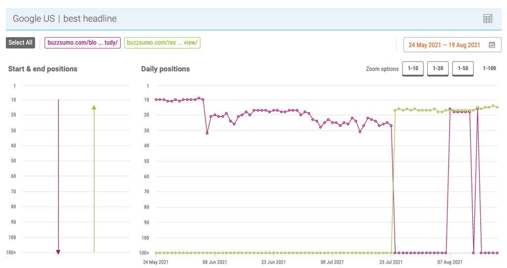 This part of the Content Analyzer shows you only the very best headlines, ordered by engagement.