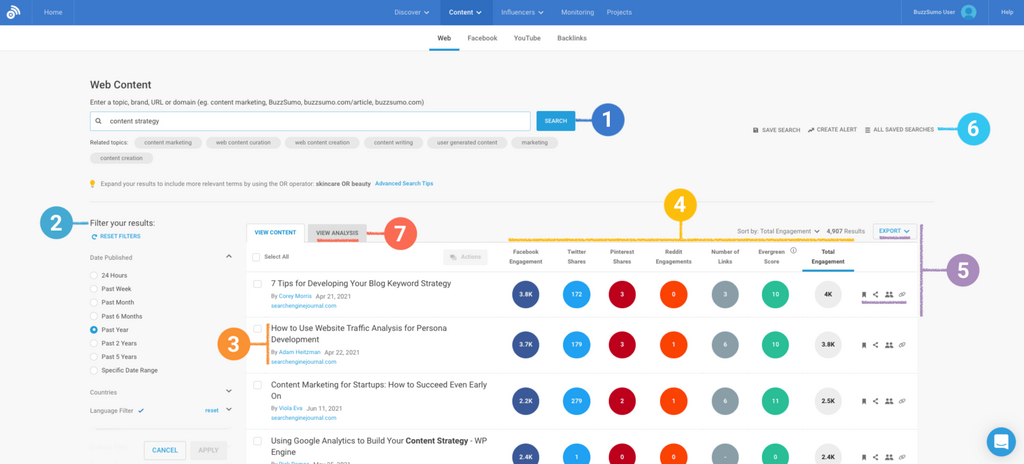 There are seven key areas to the Content Analyzer, and knowing how to use them all is key to your success with BuzzSumo.