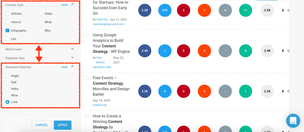 Replicating the most loved infographics to use in outreach campaigns? Select “Infographic” in the “Content type” filter, and “Love” in the “Dominant reaction” filter.