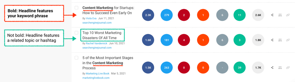 If you don’t always see your keyword phrase highlighted in bold in a headline, that’s because the headline features a related topic or hashtag instead.