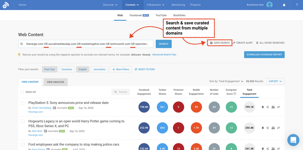 Save a search of publisher domains in BuzzSumo ⬇️