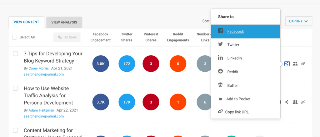 Found a content gem? Share it directly to a bunch of social media platforms from the Content Analyzer.