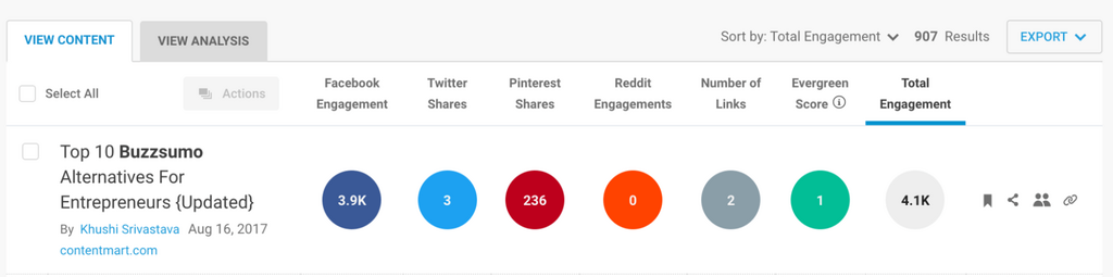 We searched our brand name "BuzzSumo" in the Content Analyzer, to find that the top returning result was a list of “BuzzSumo Alternatives”