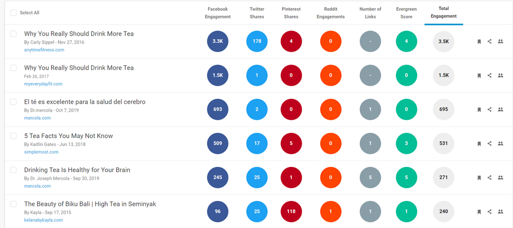 First, let’s use the BuzzSumo tool to monitor backlinks to a specific blog post so we can find opportunities for our future blogs. Let’s say we run a website about all-things tea, and we want to write a new blog.