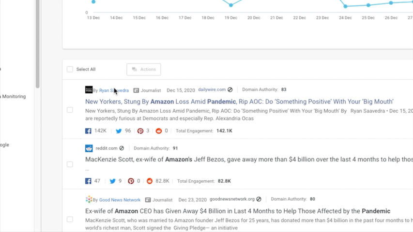 In the example below, we restricted mentions to ‘Article & Title’ and instantly found that Amazon had generated issue management worthy coverage surrounding the topic of the pandemic, that had racked up over 21k shares on social media.