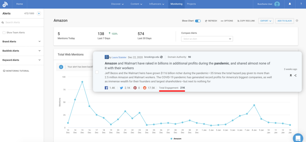 🚨 They turn to BuzzSumo, and set up a brand alert around the retailers’ product to spot mentions across the web.