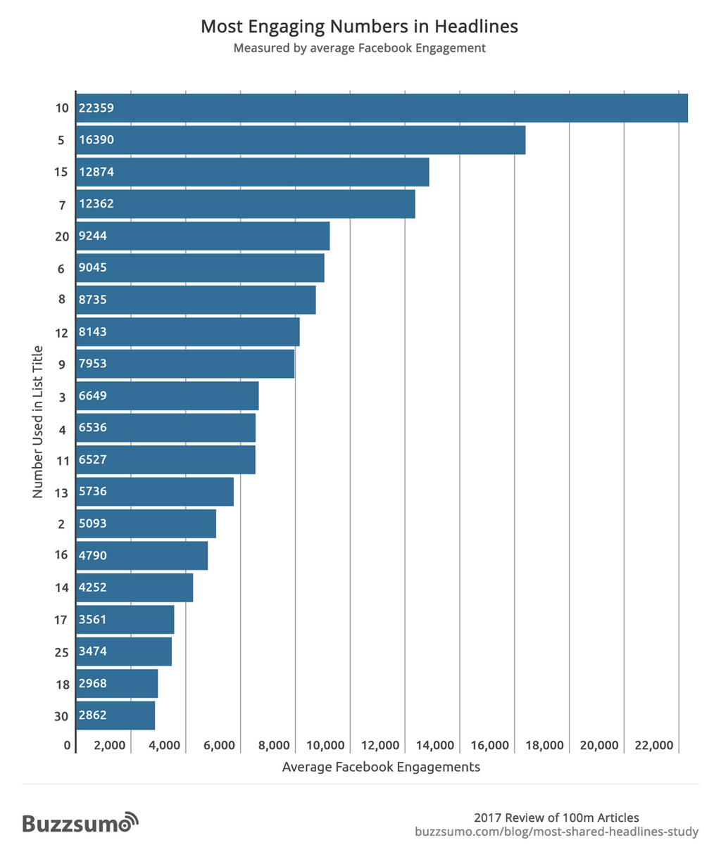 We can see that the number 10 was the highest performing headline number, which confirms previous research in this area. Our research found that the next three best performing numbers in headlines were 5, 15 and 7.