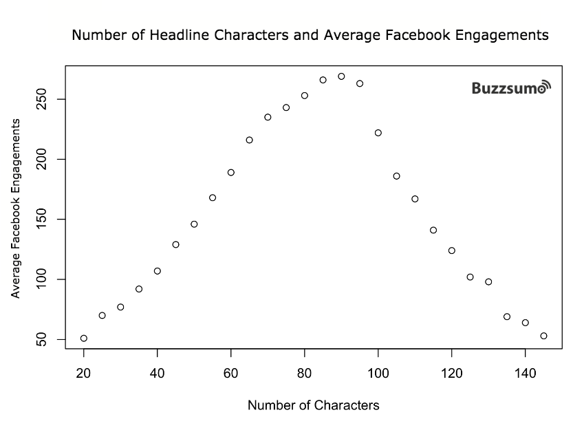 We also looked at the relationship between the number of characters in a headline and average FB engagements. Our findings were as follows:
