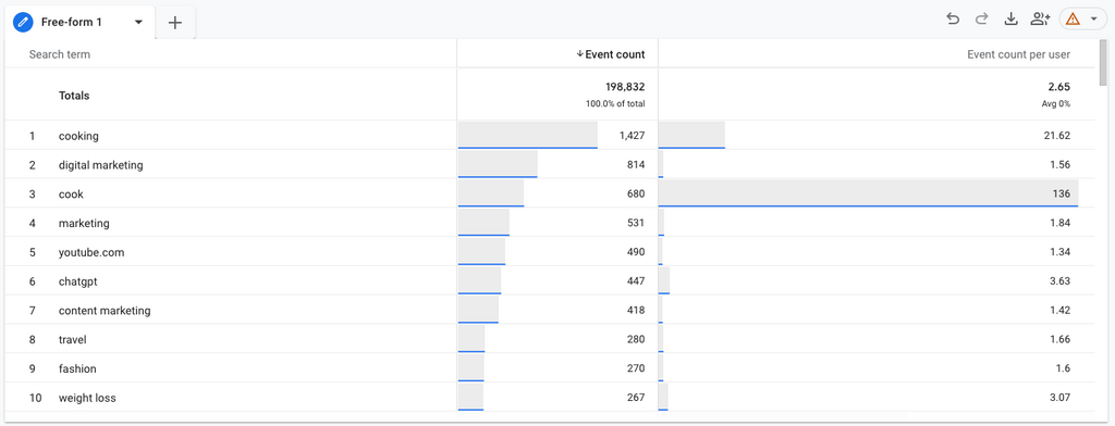 This will leave you with a report showing you the number of internal site searches, and average searches per user.