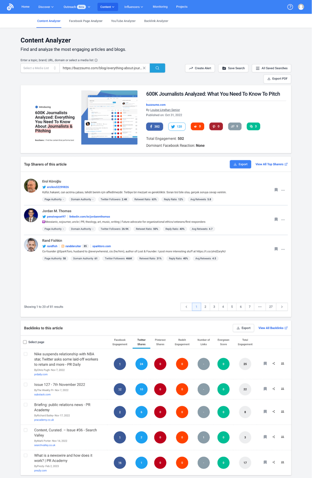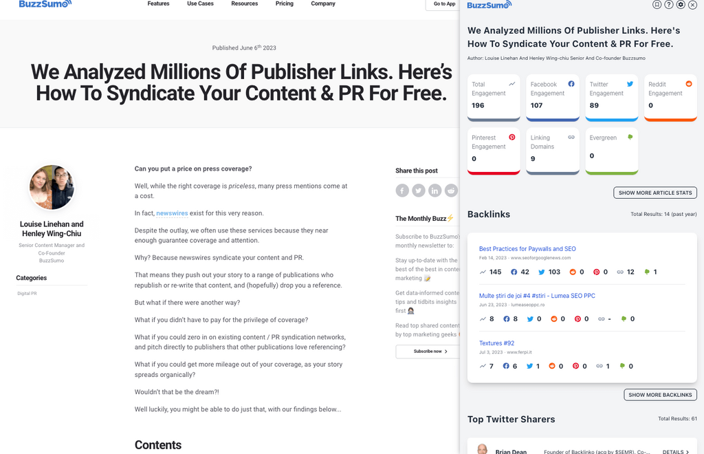 Just hit BuzzSumo icon in your browser when you’re viewing your PR content, and get a full breakdown of engagement, backlinks, and top Twitter sharers.