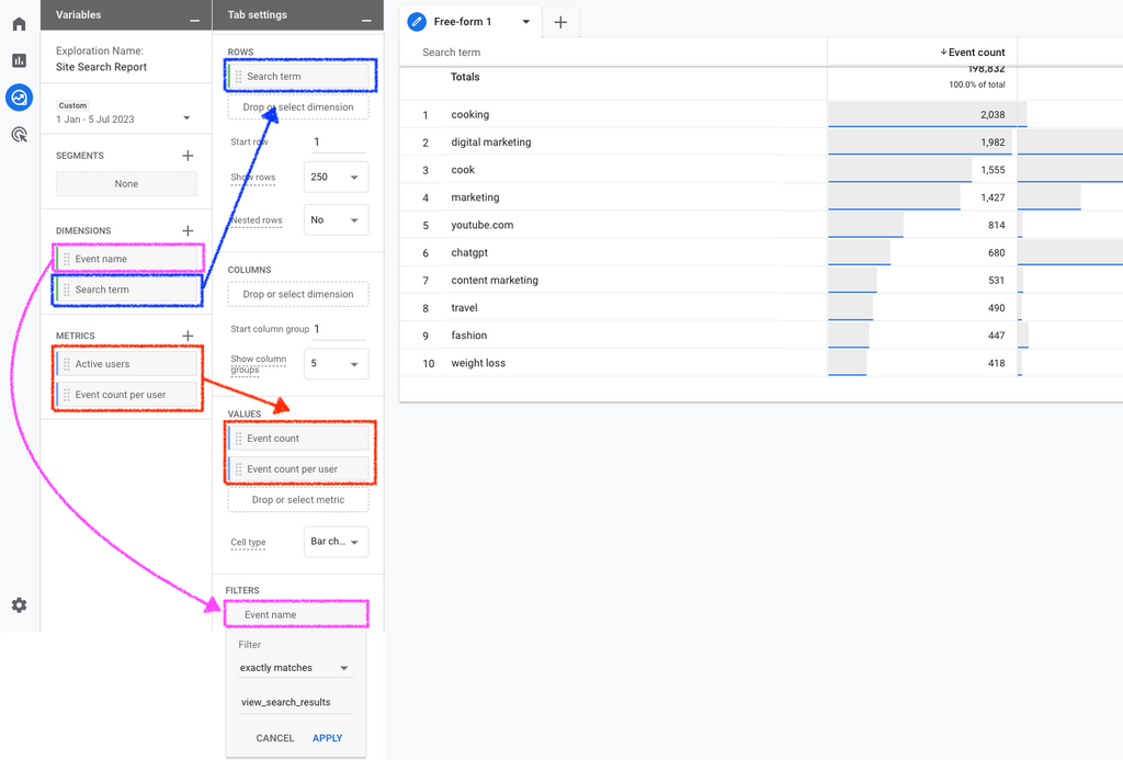 Since we’ve already covered how to set up a custom report in the “Explore” part of GA4, we won’t dive into the configuration in as much detail.
