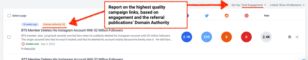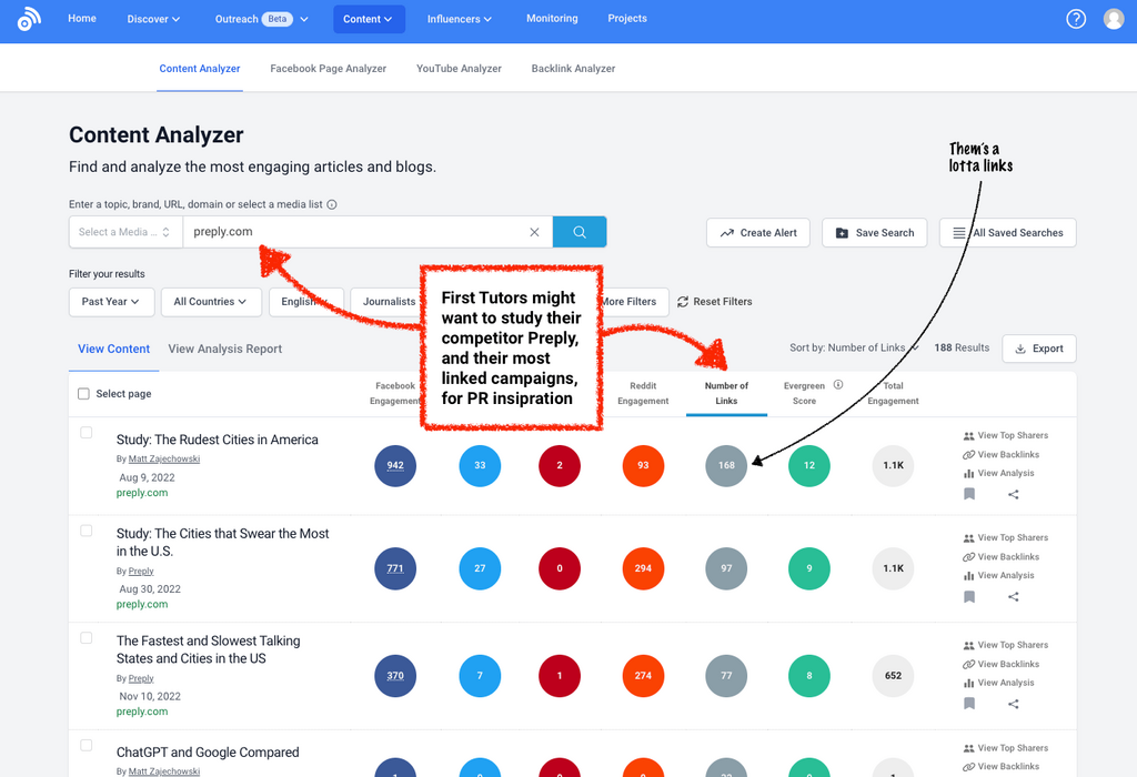 Analyze the PR success of yours or your client’s competitors, by searching their domain in the Content Analyzer, and sorting by their most linked articles…