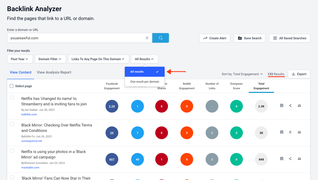 Or “One result per domain” to see only the most engaging links from unique referring domains.