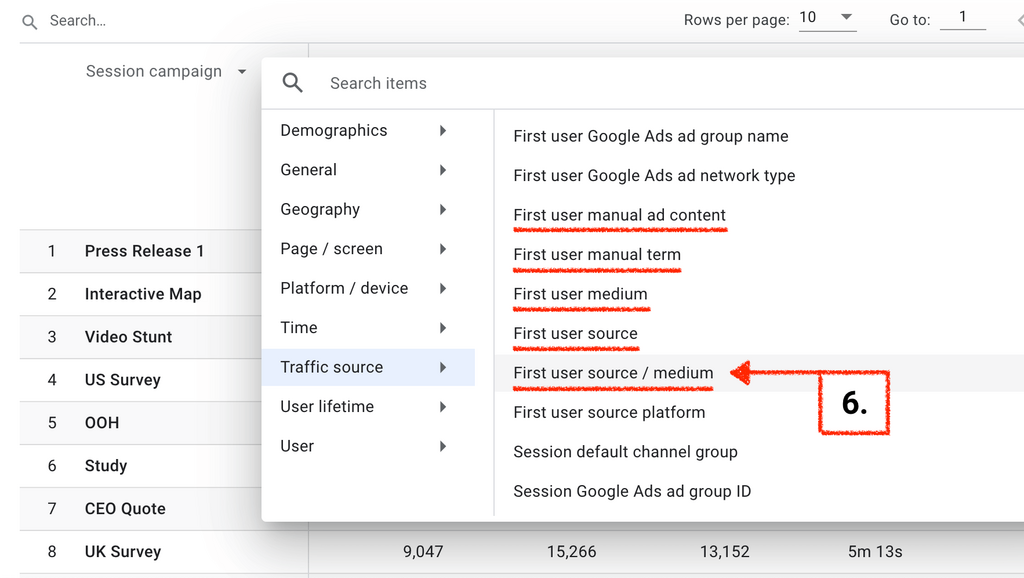 To get more granular information on the source, medium, or term of your UTM campaign hit the plus next to “Session campaign” dropdown to add a secondary dimension.
