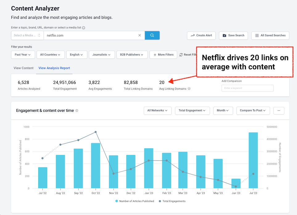 For example, according to our Content Analysis Report tab, Netflix drives 20 links on average per piece of content.