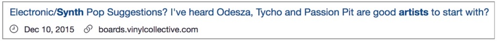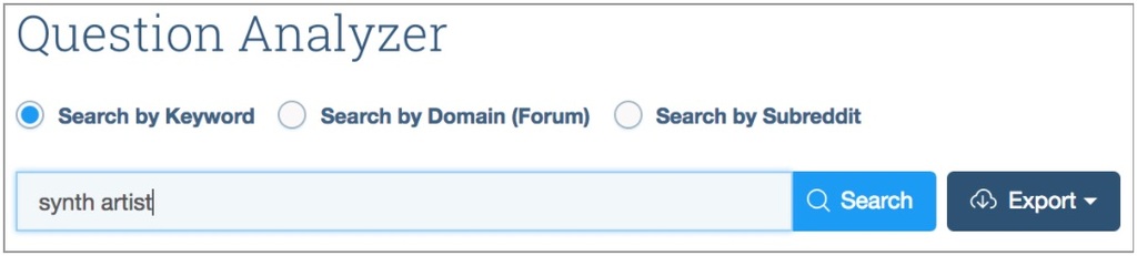 The first step is to use key terms that might be part of the question, and submit as the input within the Question Analyzer search field. Because we’re trying to produce the same output as the Synthesizer Facebook group example above, let’s broadly use the terms “synth artist” which should hopefully provide enough results, so we can quickly locate our answer.