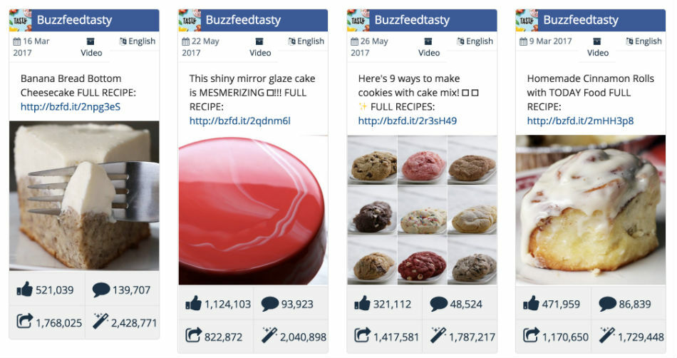 As we can see food is a very popular topic. Pages such as BuzzFeed Tasty get very high levels of engagement. Below are their top four videos in the last 6 months. Turns out that Banana Bread Cheesecake is considerably more engaging than Real Estate – in Facebook videos, at least…