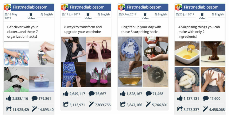 When it comes to DIY, pages like First Media Blossom also generate exceptionally high levels of engagement. Below are their top videos in the last year.