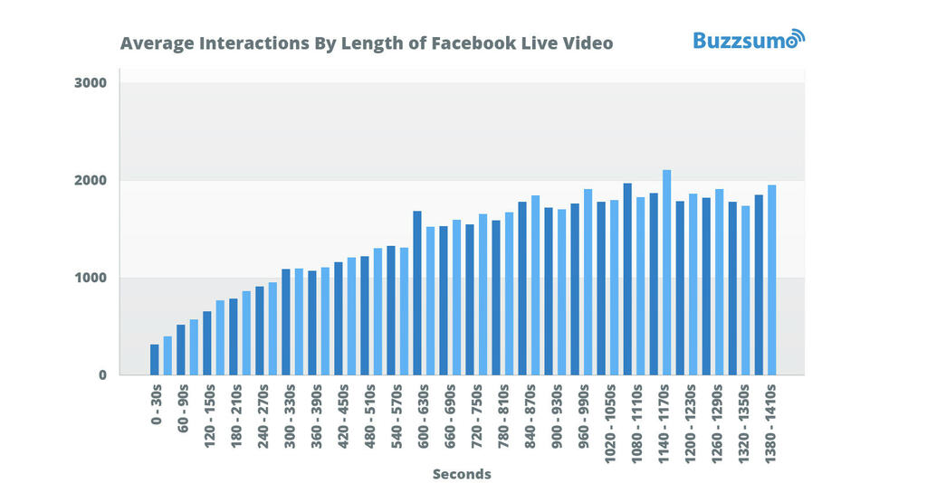 Our analysis of Facebook Live videos found that interactions increase the longer the video lasts, until about 15-16 minutes. After this time the interactions remain fairly stable.