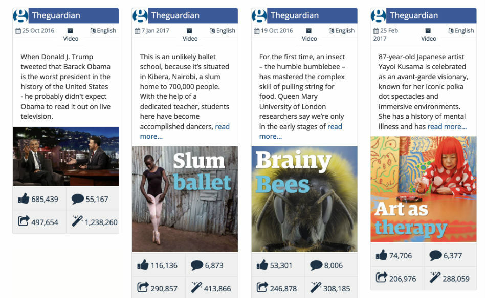 For major publishers, such as The Guardian, the most engaging articles on their website are traditional text articles. But when it comes to Facebook, the top performing content is video. Below are their top four posts ranked by engagement.