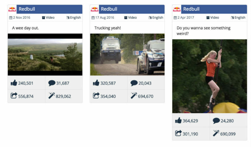 As an example here are the top three video posts for the Redbull Facebook Page. They keep the introduction very short and just get you to dive into the video: