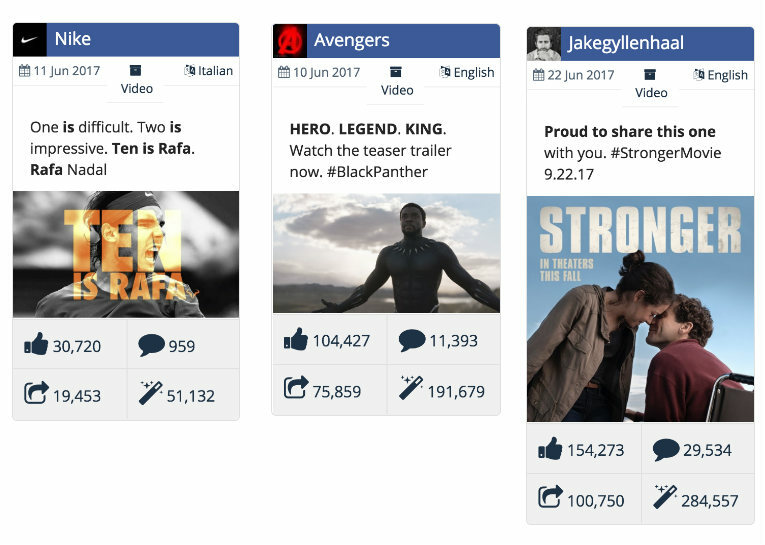 The top videos generating love reactions tended to be more reactions to films, sports stars and celebrities. Here are a few examples.
