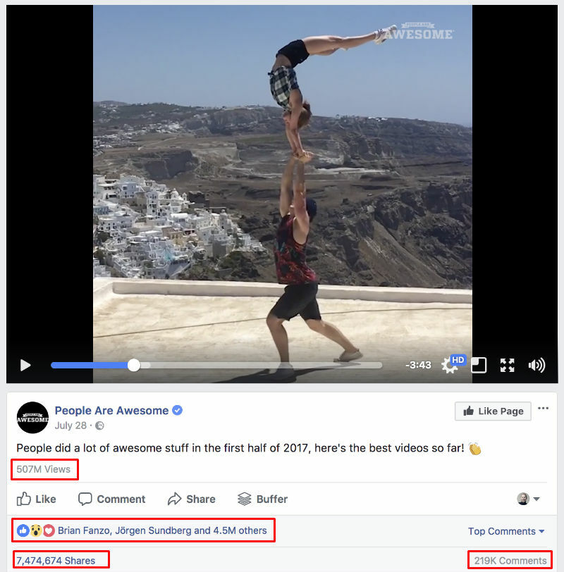This Facebook video posted by People are Awesome (19m page likes) is a celebration of the amazing things that people can do. It gained over 500m views and over 10m shares, likes/reactions and comments.