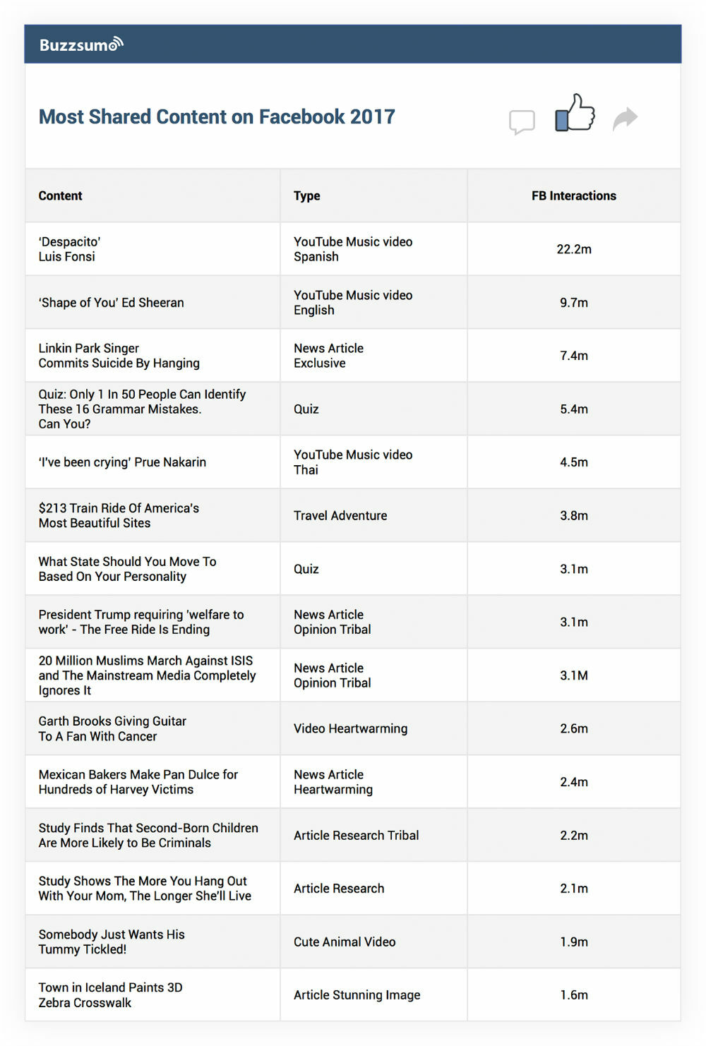 Music videos remain one of the most shared forms of content. This video by Ed Sheeran was the second most shared content on Facebook gaining almost 10m shares.