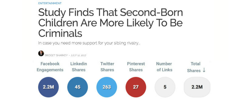 Articles that report the findings of studies tend to do particularly well on Facebook, including ‘science says’ style articles. This article below reported on a research study from MIT, Northwestern and University of Florida about the criminal propensity of siblings. It is the type of content that families may share for fun as much as for the value of the research. My eldest actually shared this post on Facebook and tagged his younger sister. It’s a nice example of research and tribal posts combined. And a great way to get at your siblings through social media. The post gained over 2m Facebook engagements.