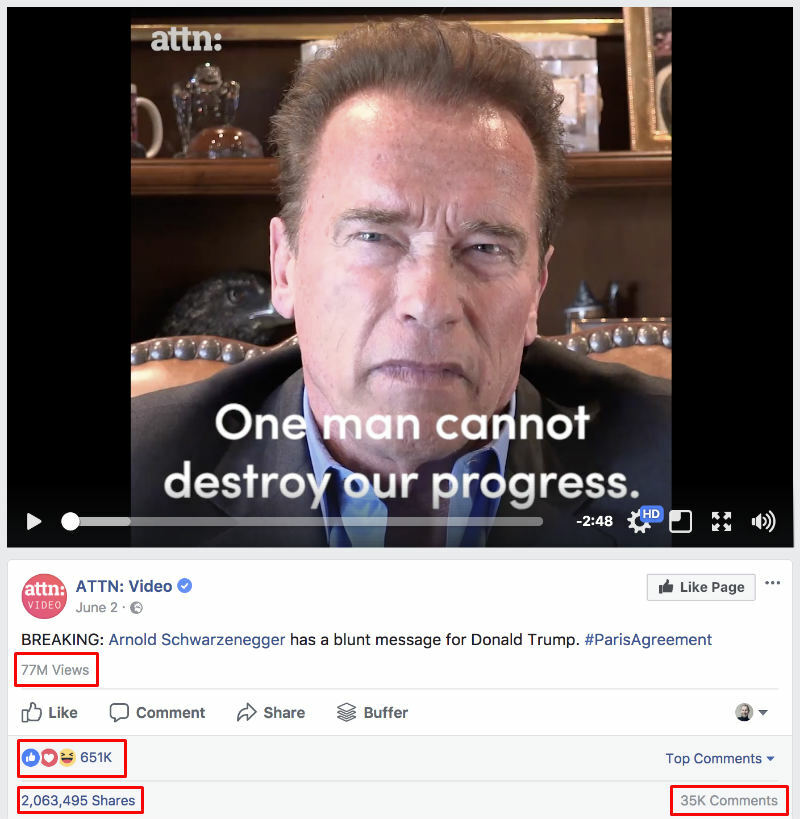 This Facebook video posted by Attn:Video of Arnold Schwarzenegger’s message for Donald Trump about the Paris Climate Agreement was viewed over 77m times, it was shared over 2m times and attracted 35,000 comments. There’s passion and rage in here which can inspire tribal engagement if you’re on his side.