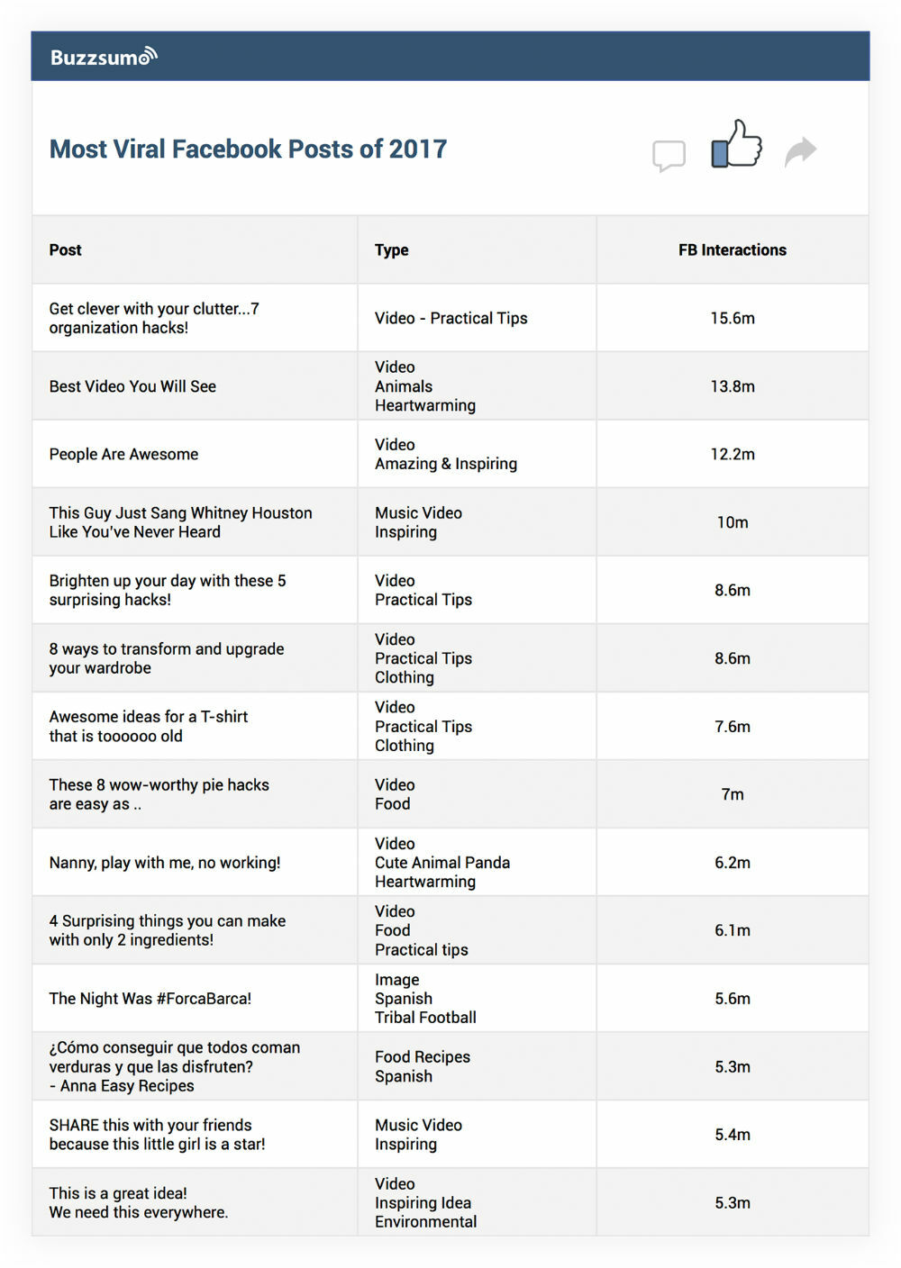 This Facebook video of practical everyday hacks was the top Facebook post in 2017. It had over 400m views and was shared over 12m times. It also had over 3m likes and reactions and 186,000 comments. We have no stats on whether people actually decluttered anything after sharing this. But it feels good to know it’s possible.