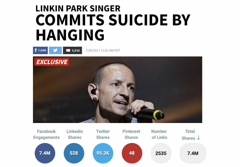 People are quick to share breaking news on Facebook. Over 44% of Americans get their news from Facebook (fake or otherwise). However, the sharing can be very fragmented as there are often tens if not hundreds of articles on the same news story. In this example, the initial exclusive reporting of the suicide of Chester Bennington by TMZ gained over 7m Facebook engagements. This particular story may have gained extra traction as it is about a musician but also because it was a very tragic human story.
