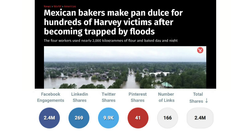 Feeling good is good for you, and good for Facebook engagements. This heartwarming story of Mexican bakers supporting the victims of flooding after Hurricane Harvey was widely shared on Facebook, gaining over 2.4m engagements. It was the top post on The Independent newspaper this year.