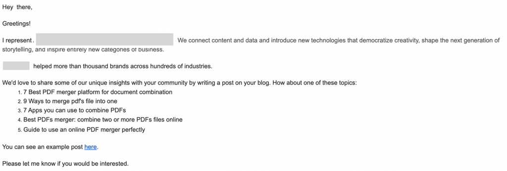 I thought this strategy went back into the shadows along with anyone who called themselves “blackhat SEOs” a decade ago, but even Fractl has seen a massive surge in these emails recently: