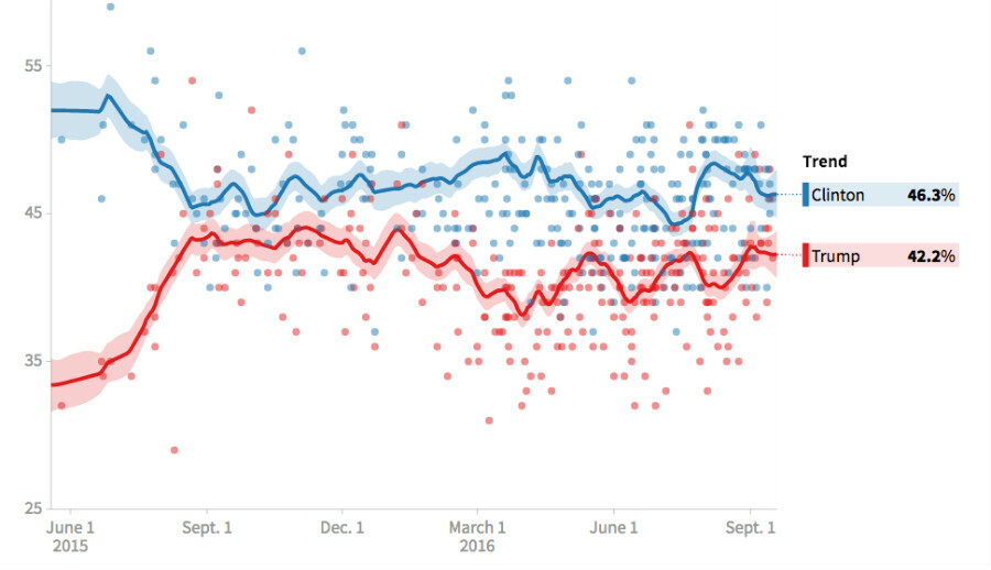 Comparisons and trends are used in extensively in telling political stories. For example, this image from the Huffington Post shows the the story of the current US political presidential campaign using opinion poll data.
