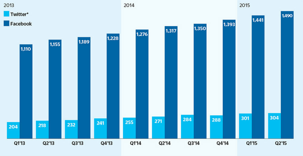 A common data-driven narrative is comparisons. For example, we can take a different angle on Twitter’s failure to grow its active users by comparing how it is performing relative to Facebook. This has been a story angle taken by a number of publications. Below is an example chart used to show how Facebook is outperforming Twitter.
