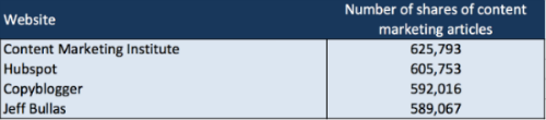 This first table below shows the sites with the most shares of articles about content marketing in the 12 months to February 2016.
