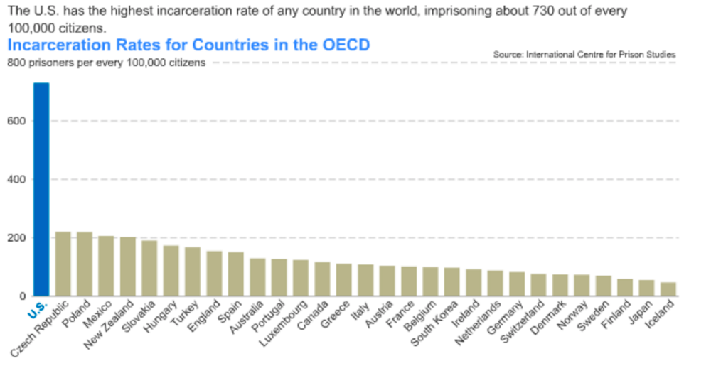 The chart above shows US incarceration rates relative to other OECD countries. However, the US also has higher incarceration rates than China or Russia and higher numbers of people incarcerated.