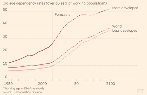 We have probably all know that the population is ageing. The FT chart below tells a story about the potential economic impact of these changes by showing the number of people over the age of 65 as a percentage of the working population.