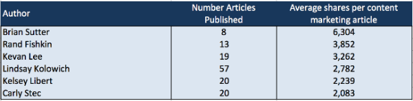 This second table shows the authors with the highest average shares of articles on content marketing. Brian Sutter‘s articles on Forbes have helped make him the author with the highest average shares. All credit though to Lindsay Kolowich for a really consistent level of shares for her content marketing articles on Hubspot.
