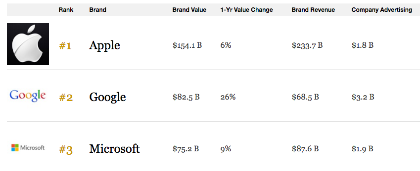Rank order or league tables are another common narrative suited to data. Here is an example from Forbes of the world’s most valuable brands.