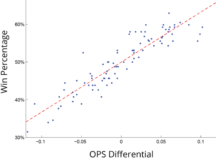 One of the most famous examples of exploring data relationships was highlighted in the film Moneyball. In exploring baseball data it was found that some surprising factors were strongly correlated with a team’s win percentage. One of these was OPS (on-base plus slugging). This adds together a player’s on-base percentage, the percentage of time a player gets on base and the average number of bases a player reaches when they come to the plate (slugging). The data found a very strong correlation between the OPS and the win percentage as we can see below.