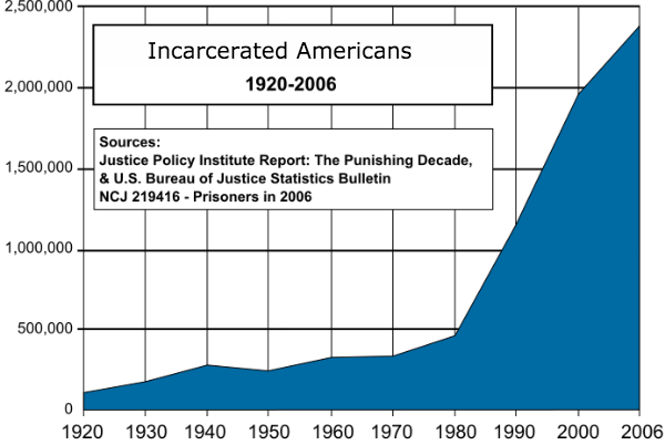 This chart begs the question why did incarceration rates increase so rapidly after 1980? You will need to do your own research but articles I have read suggest that privatisation of prisons and a different approach to incarceration for drug crimes may be responsible. This type of relationship analysis is at the core of the hugely successful Freakonomics books.