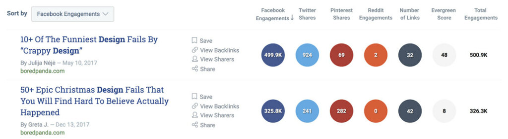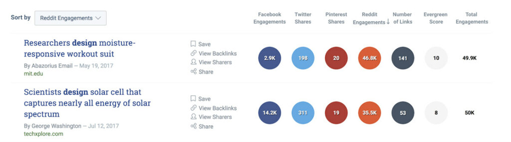 The content that engages the Reddit audience is often very different to the content that engages audiences on other social networks. This can be seen in just a few simple BuzzSumo searches. For example, if we search for ‘design’ and sort by Reddit engagements we can see that top content is about the design of a workout suit and a solar cell.