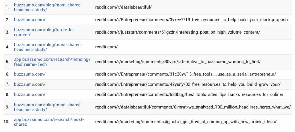 Reddit can also be a good source of traffic. To check whether Reddit currently drives traffic to your site dig into your Google analytics. Simply go to “Social,” then “Network Referrals”. Find and click on reddit, then use the secondary dimension option to choose “Behavior” and then “Full Referrer”. This will show you the specific sub-reddits that are driving traffic to your site. For example in our case they are as follows.