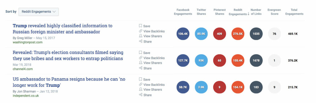 For example, below are some of the articles about Donald Trump that gained more engagements on Reddit than on other networks. The top post gained over 250,000 engagements.