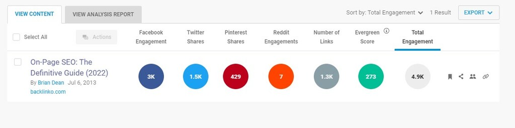 Now that you have a list of potential pieces of content to repurpose you can double-check Evergreen Scores and total engagement across different channels, in BuzzSumo’s Content Analyzer.