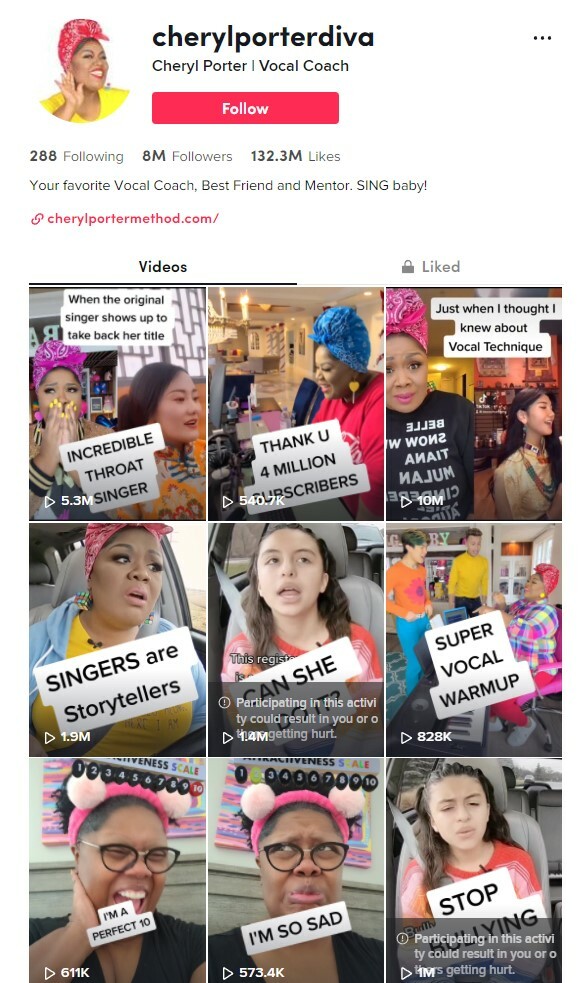 Cheryl Porter, a vocal coach selling singing courses, excels at content repurposing. YouTube videos get turned into several short vertical videos which are then used on TikTok, Instagram, and Facebook.